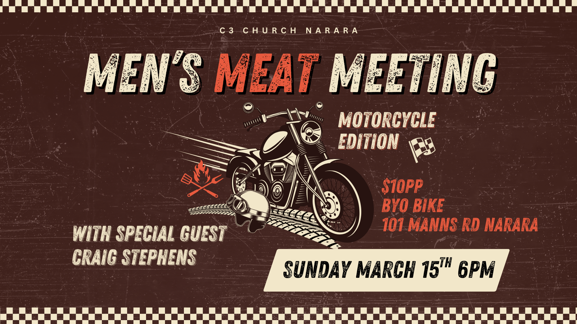 Men! Our quarterly Meat Meetings are back! Great times to connect over a seriously good feed. Kicking off Sunday March 15th with a Motorcycle Edition with local legend Craig Stephens.
